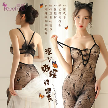 極性貓裝!胸前深V蝴蝶結後腰鏤空連身網衣