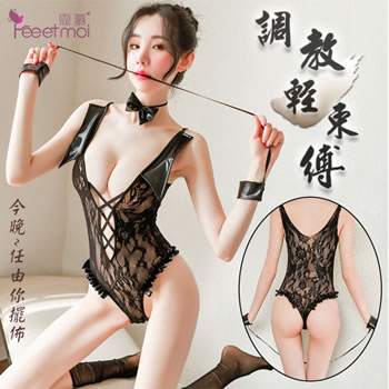 極性貓裝!單斜肩緹花開檔鏤空四件組 - 束縛牽引手環