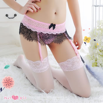 楚楚可人.睫毛蕾絲撞色吊襪帶三件組(粉)