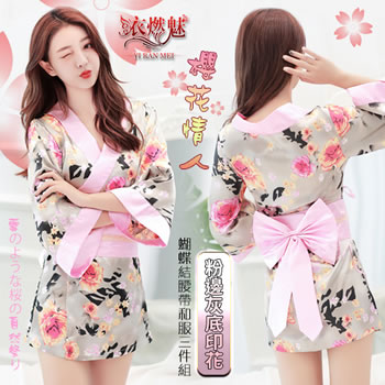 櫻花情人!立體蝴蝶結腰帶和服三件組﹝粉邊灰底印花﹞