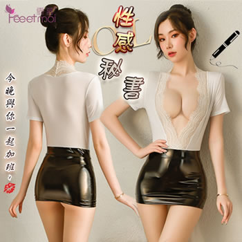 秘書角色扮演服!深V及腰蕾絲半覆酥胸拼接漆皮二件組﹝白+黑﹞