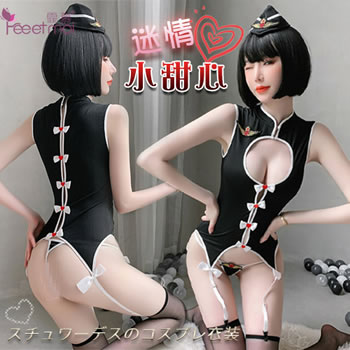 空姐角色扮演服!胸前挖空愛心蝴蝶結吊襪帶四件式套裝 - 含絲襪